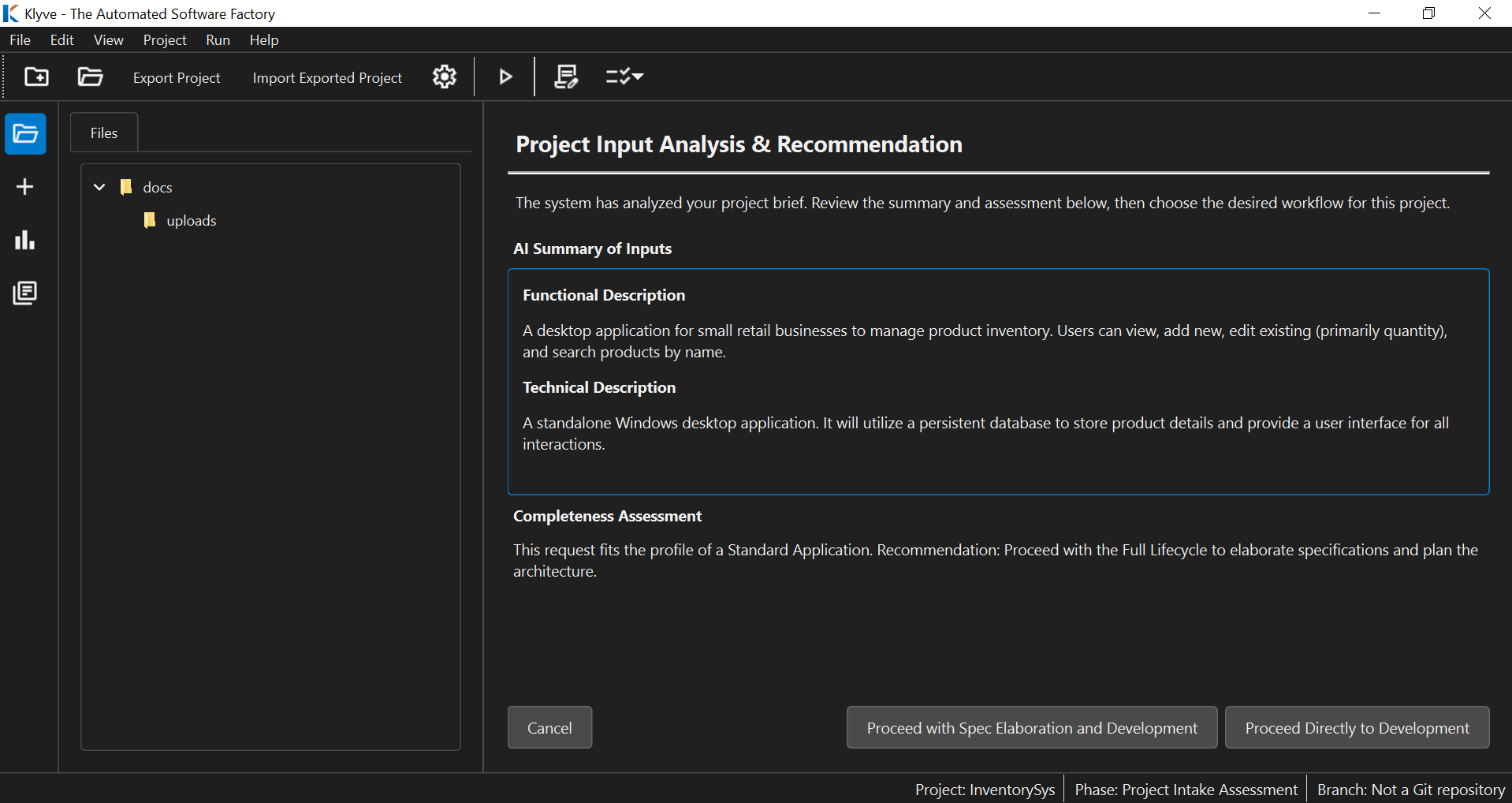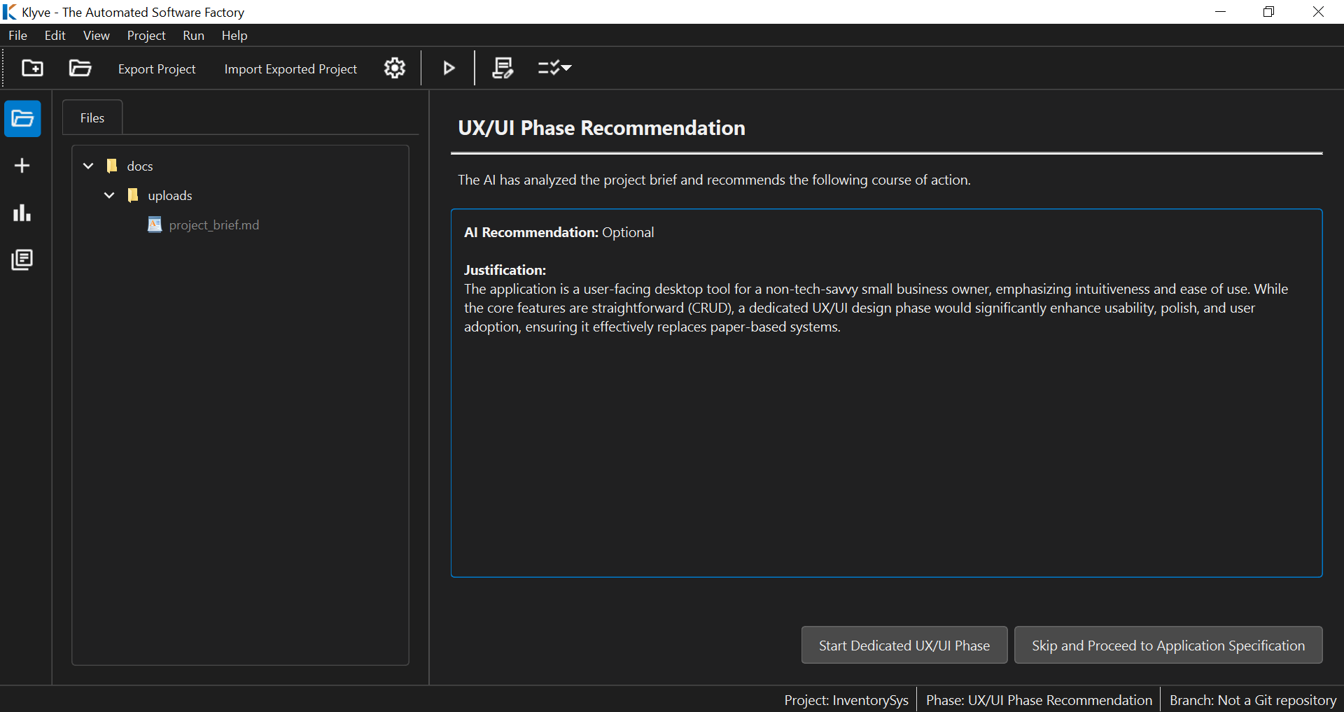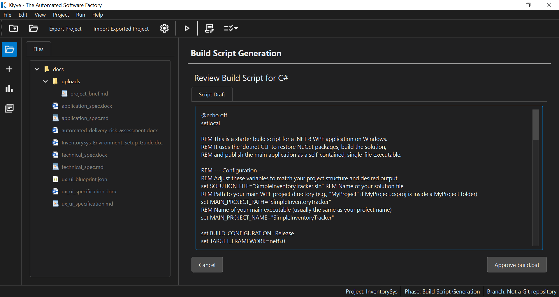 You Architect, It Builds You don’t tab-complete your way through a project. You provide your high-level requirements and technical specifications (or ask Klyve to do the detailing for you from a summary). Once you approve them, Klyve implements them.